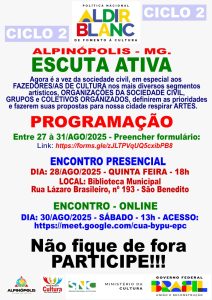 É com muita satisfação que Alpinópolis chega ao ciclo 2 da Política Nacional Aldir Blanc de Fomento à Cultura, e neste sentido realizar processos de participação social cidadã, conforme os princípios estabelecidos na origem da Lei 14.399/22, que instituiu a Política!
